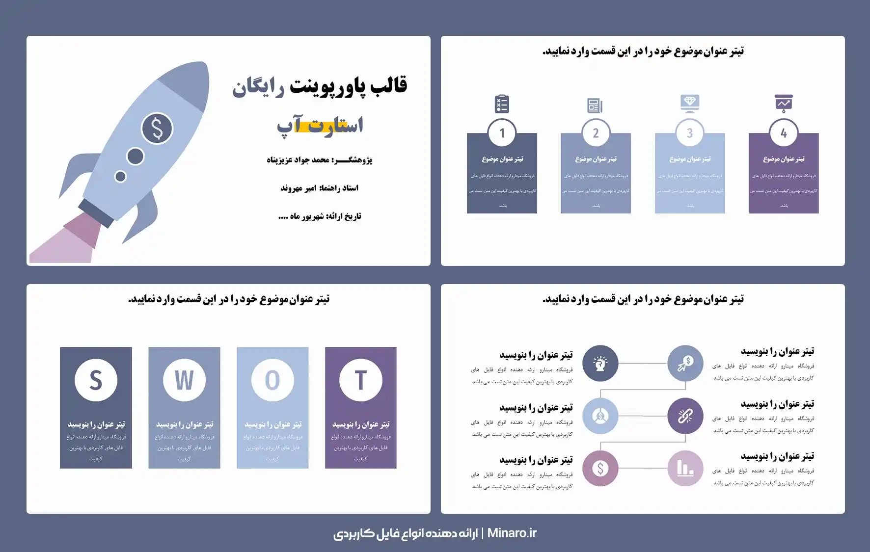 قالب پاورپوینت استارت آپ رایگان، با داشتن اسلایدهای متنوع با طراحی مدرن و قابلیت ویرایش، به افراد امکان میدهد تا ارائههای حرفهای و جذاب برای معرفی استارتاپ خود یا پروژههای مرتبط با کارآفرینی داشته باشید. تم پاورپوینت رایگان استارتاپ مینارو، با داشتن ابعاد استاندارد، قابلیت اضافه کردن المانهای گوناگون و تم رنگی زیبا، بهترین ارائه را به ارمغان میآورد.