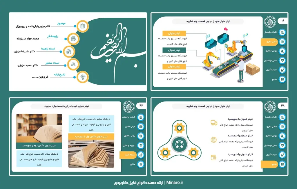 در این محصول جذاب، سربرگ تخصصی وجود داشته که جدایی از حرفهای کردن تم، برای ارائه در جلسات پیش دفاع و دفاع مناسب است.
